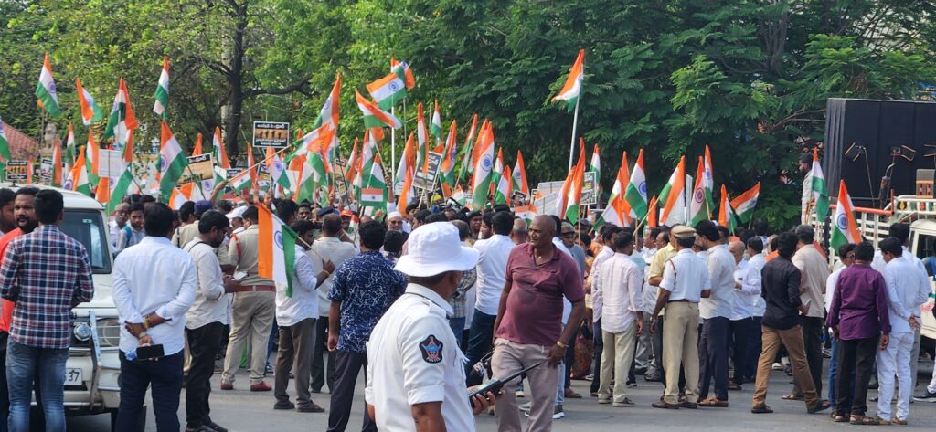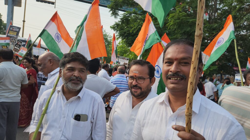 గుంటూరు, ఆంధ్రప్రదేశ్, మే 17, 2025 – ఈ రోజు ఉదయం గుంటూరులో “మన దేశ ప్రధానమంత్రి” శ్రీ నరేంద్ర మోడీ గారి పిలుపు మేరకు ఉగ్రవాదానికి వ్యతిరేకంగా ఒక భారీ ర్యాలీ జరిగింది. ఈ కార్యక్రమంలో ఎన్డీఏ భాగస్వామ్య పక్షాలైన తెలుగుదేశం పార్టీ (టీడీపీ), జనసేన, భారతీయ జనతా పార్టీ (బీజేపీ) నాయకులు, కార్యకర్తలు, మరియు కుల, మత భేదాలకు అతీతంగా సమాజంలోని వివిధ వర్గాల ప్రజలు పాల్గొన్నారు. “ఉగ్రవాదం నశించాలి”, “పాకిస్తాన్ డౌన్ డౌన్” అంటూ జాతీయ జెండాలను ధరించి, దేశభక్తితో నినాదాలు చేస్తూ ఈ ర్యాలీ చూడముచ్చటగా సాగింది.